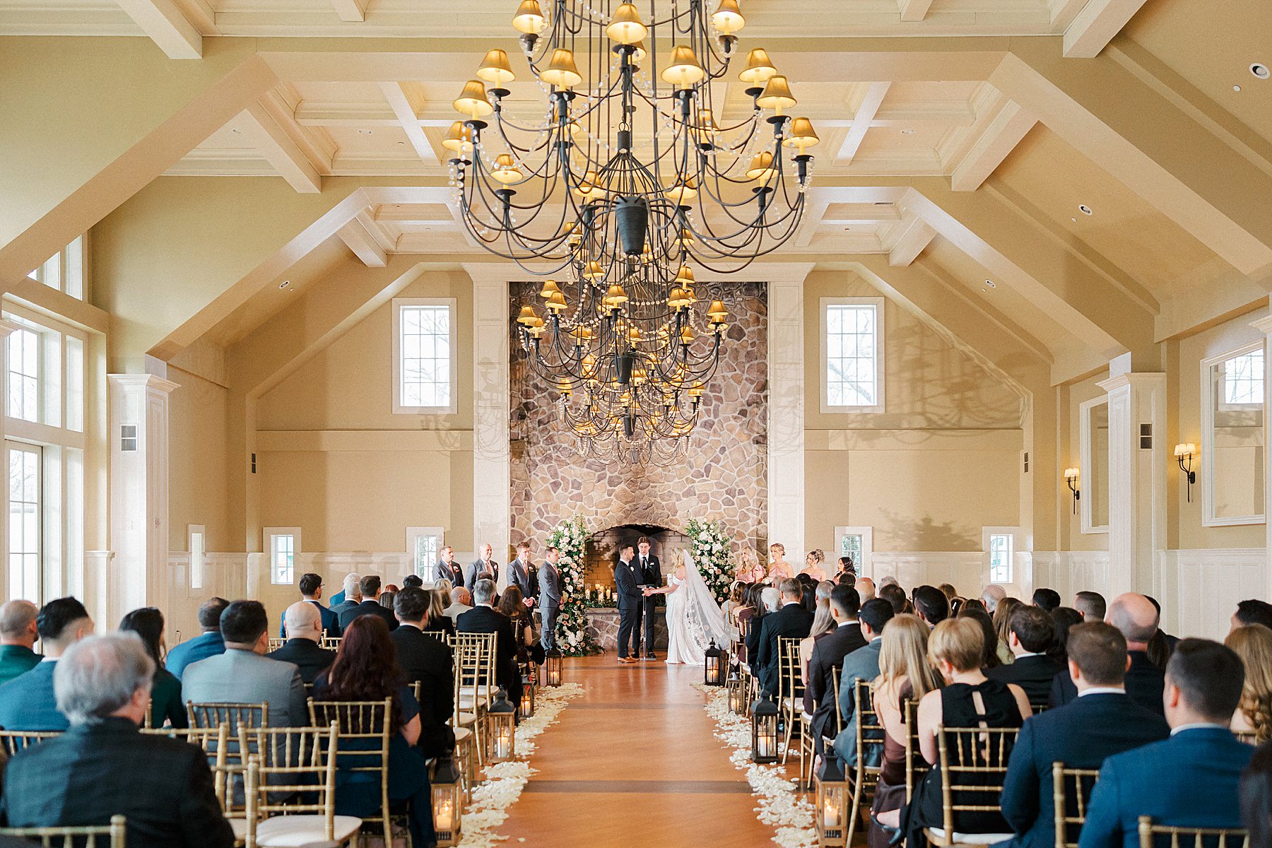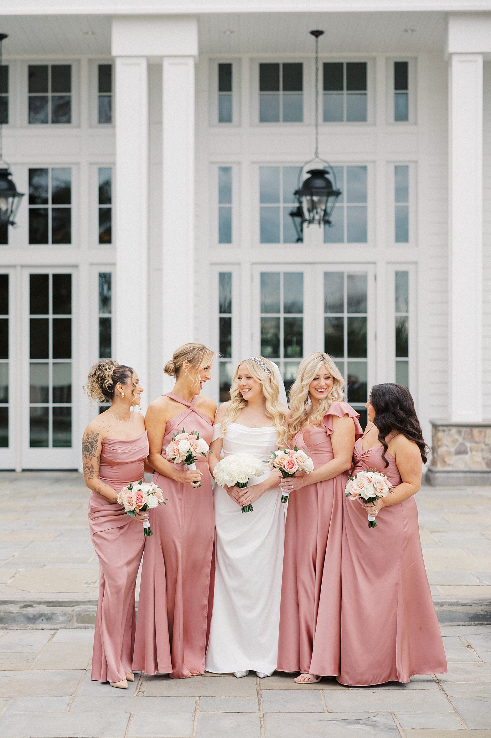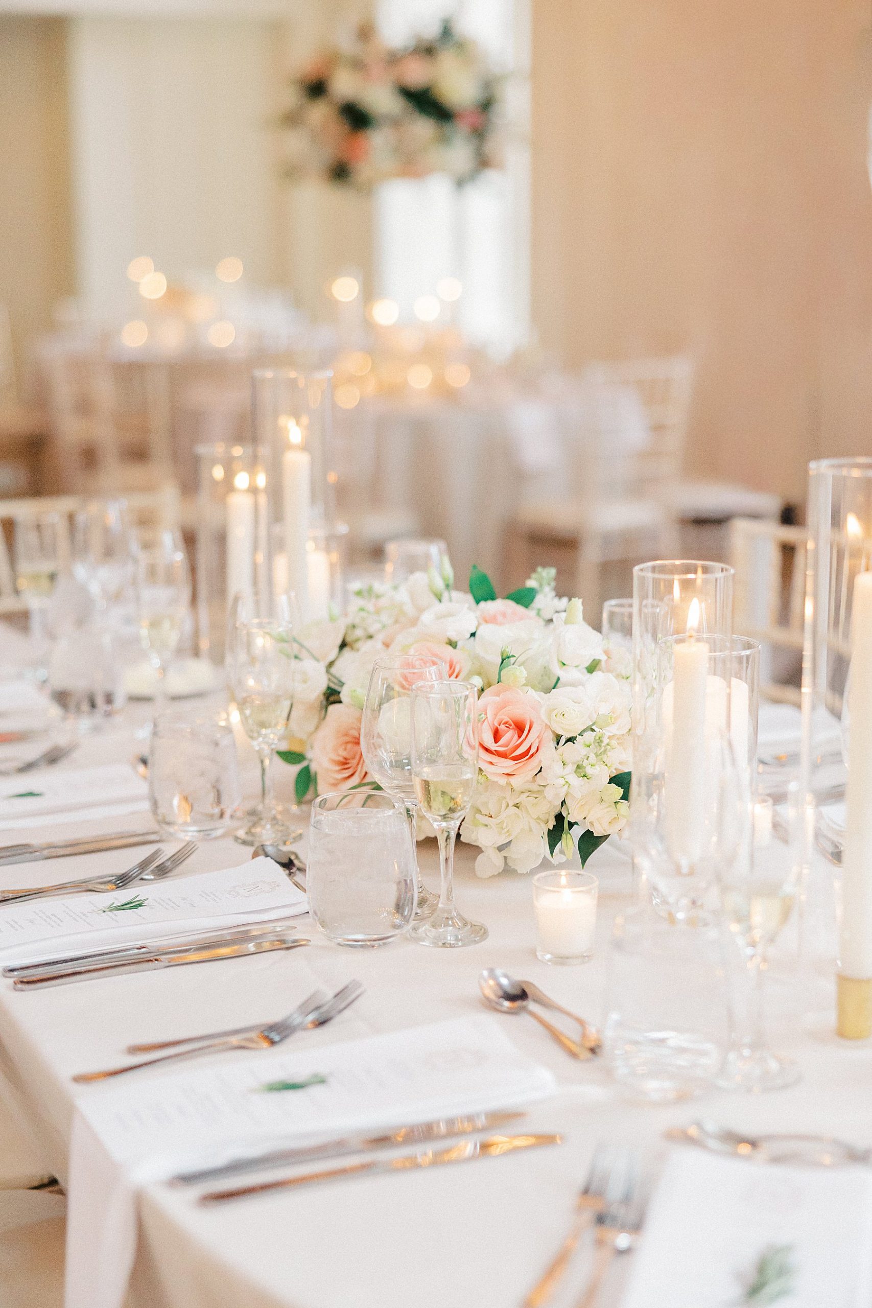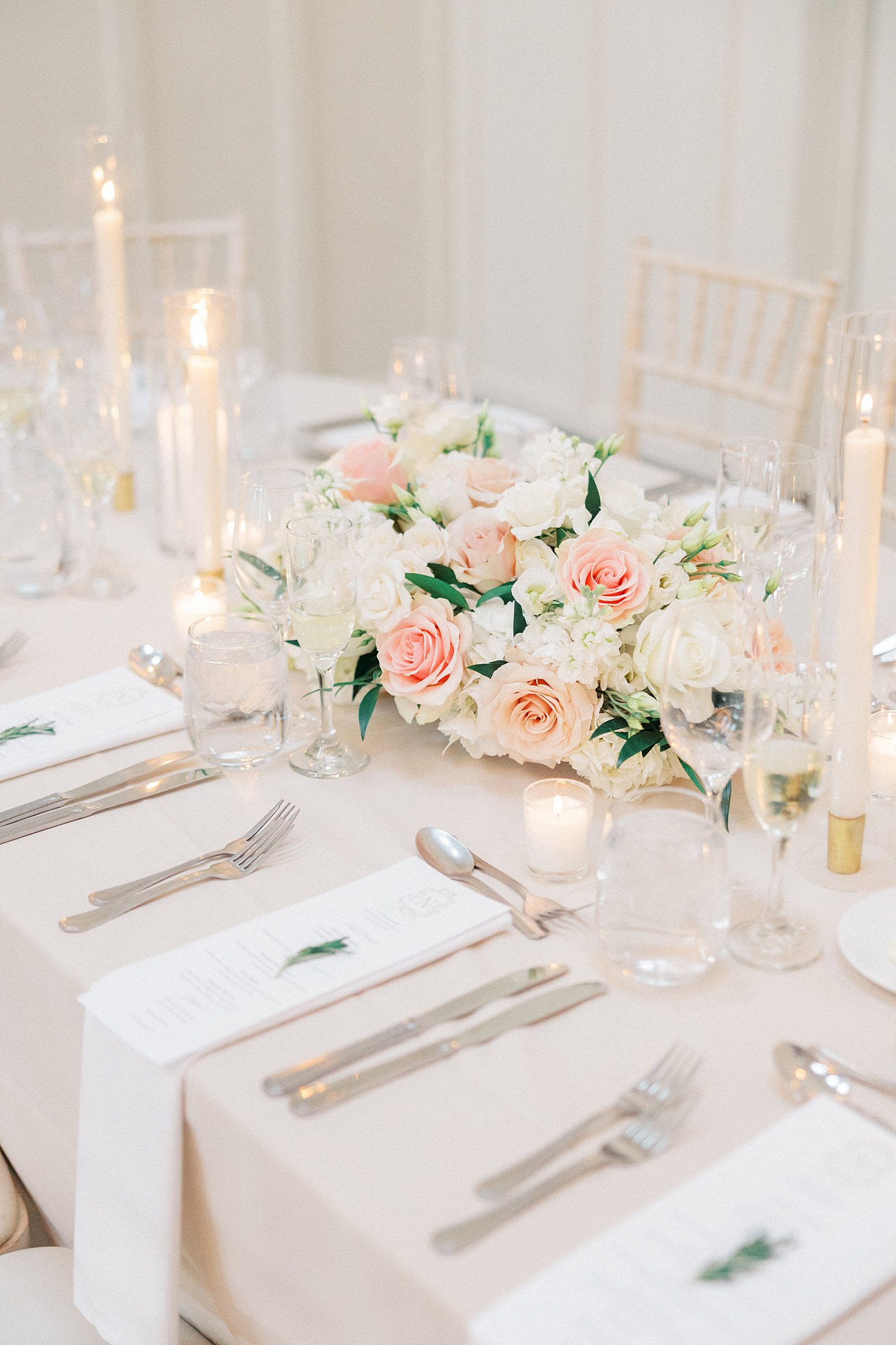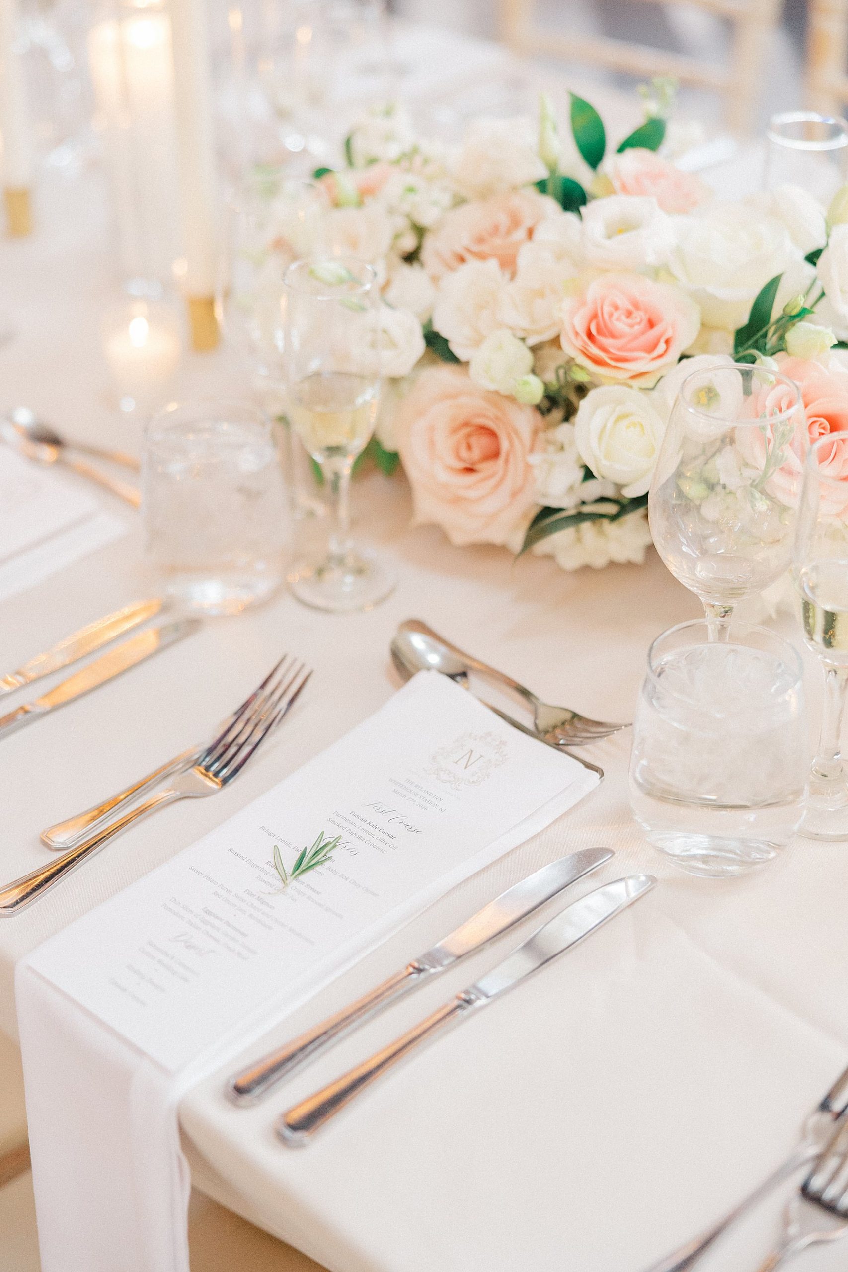 Now living in Staten Island, their days are a balance of traveling and quiet nights at home — something that felt especially present throughout their wedding day. They chose Ryland Inn for its ability to reflect both sides of their vision, pairing a classic ceremony in the Grand Ballroom with a reception in the Coach House, where the atmosphere felt warm, inviting, and effortlessly refined. Blush and ivory florals, candlelight, and the natural texture of the wood beams created a setting that was simple, romantic, and completely true to them. Samantha also carried a bouquet with a photo charm honoring her mother and grandmother, a meaningful detail woven into the day.