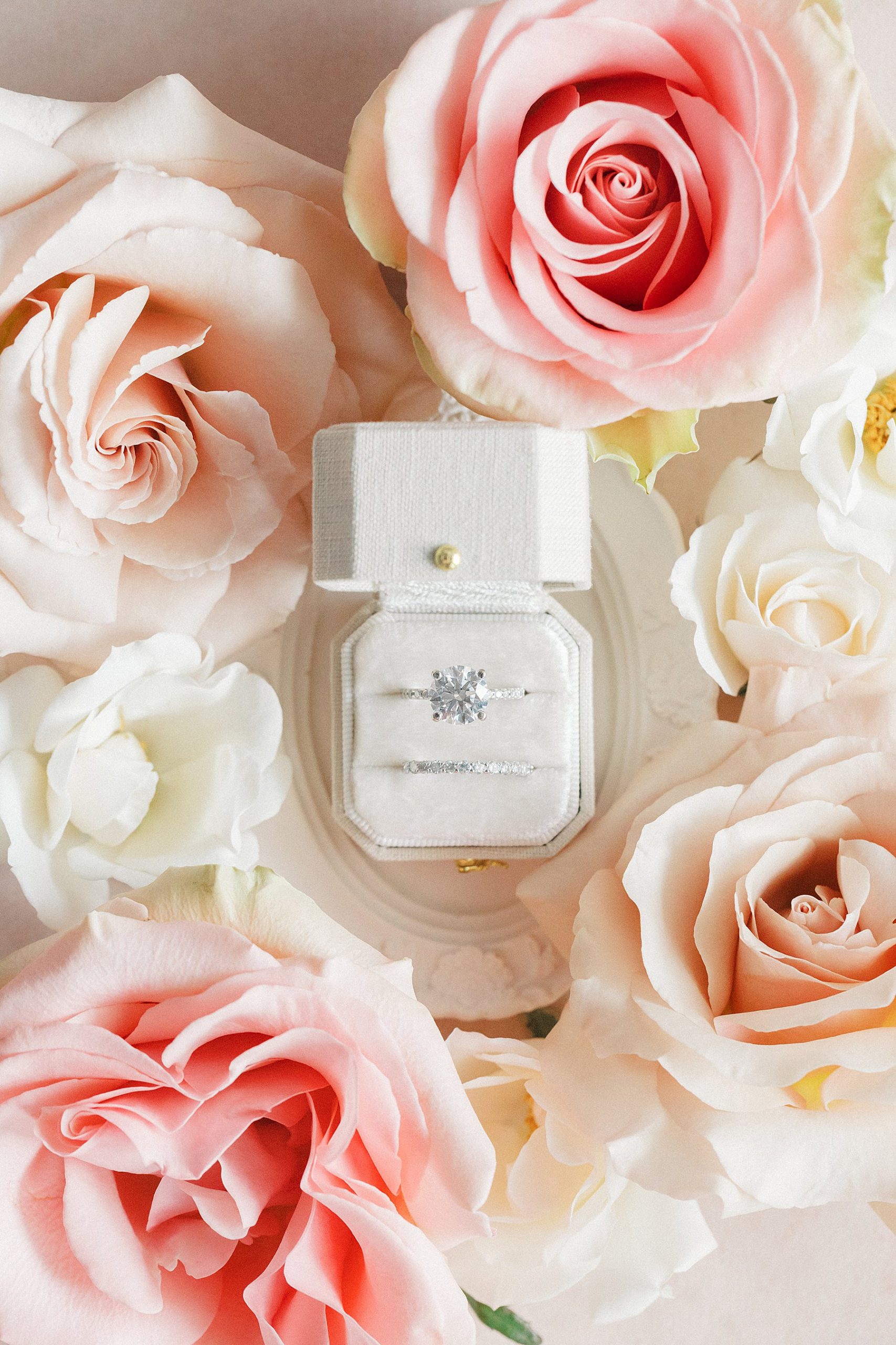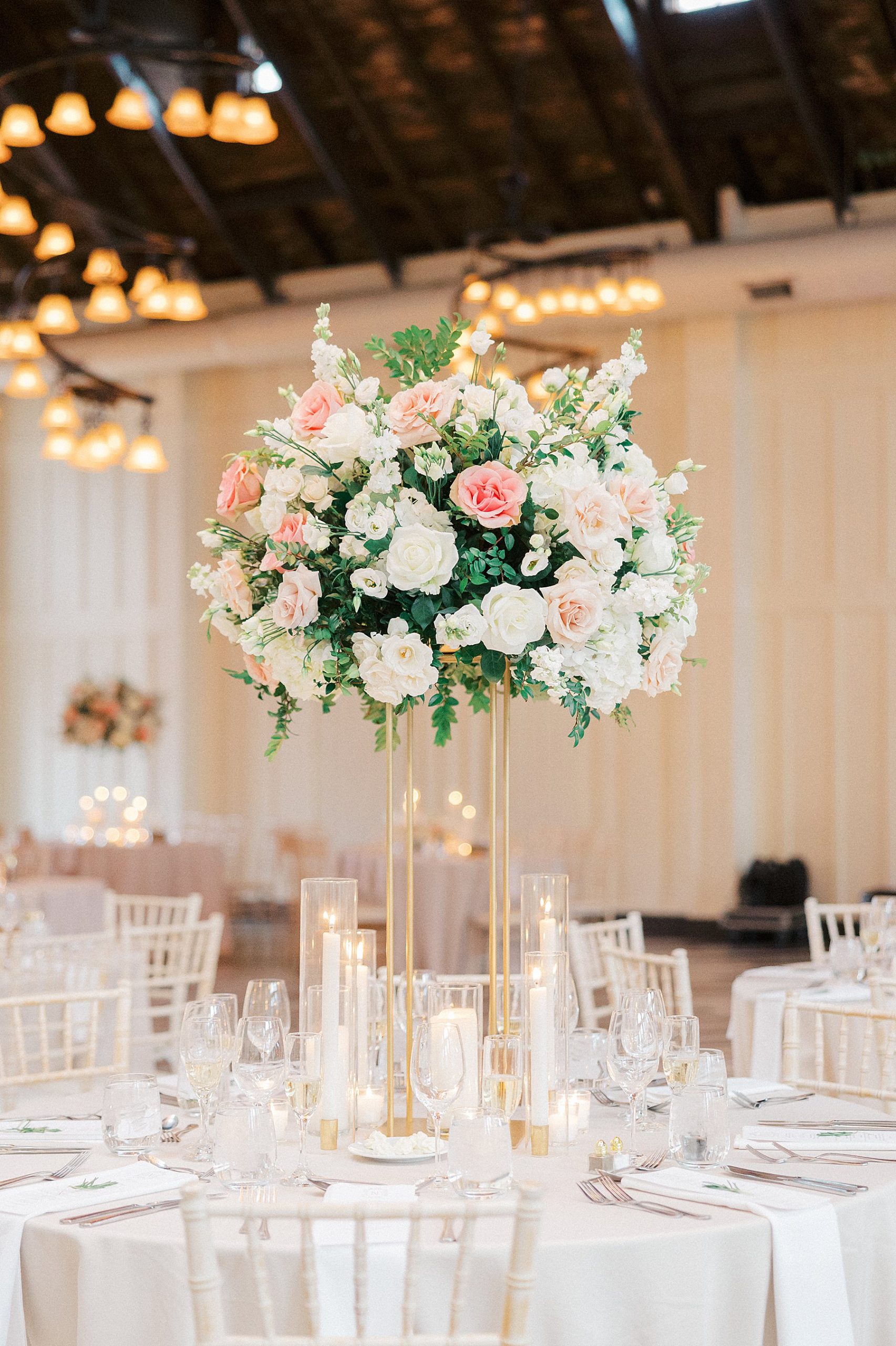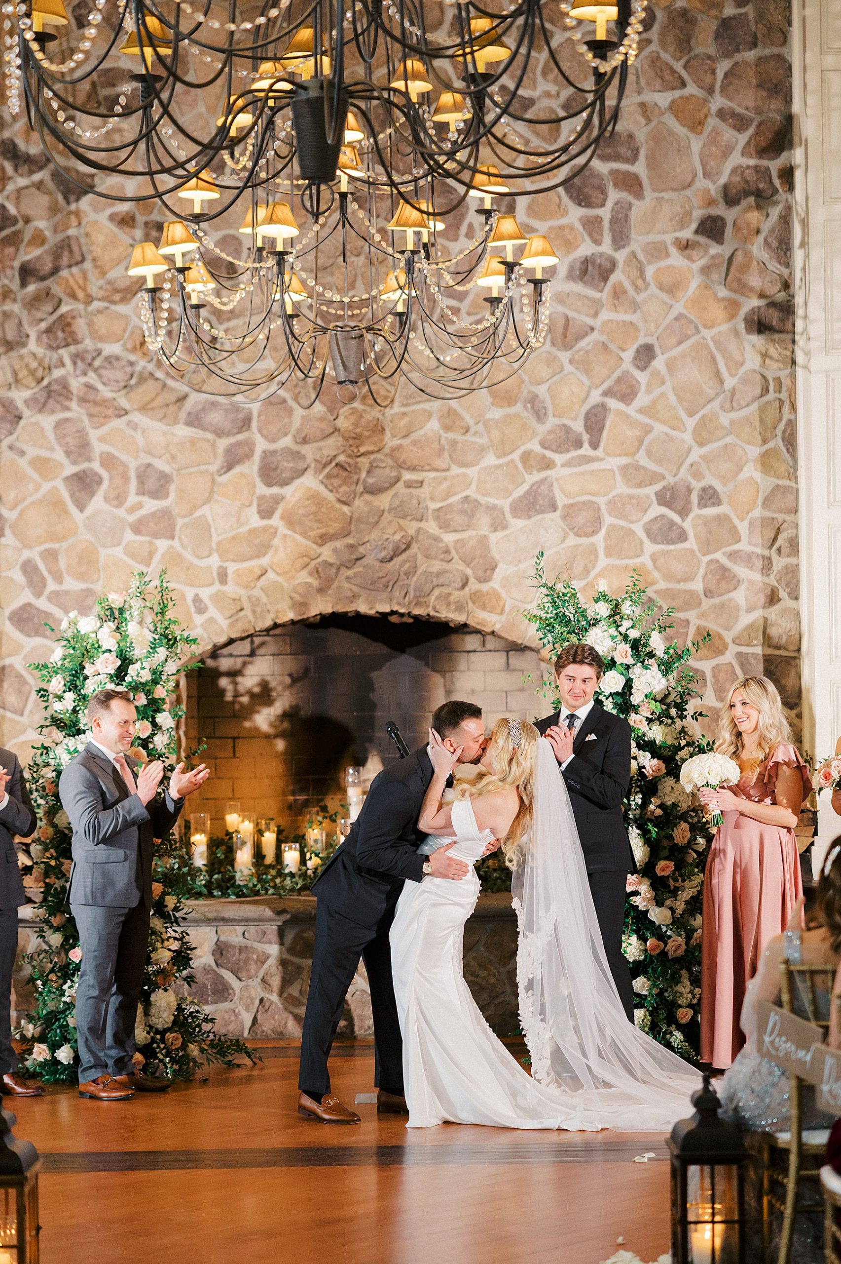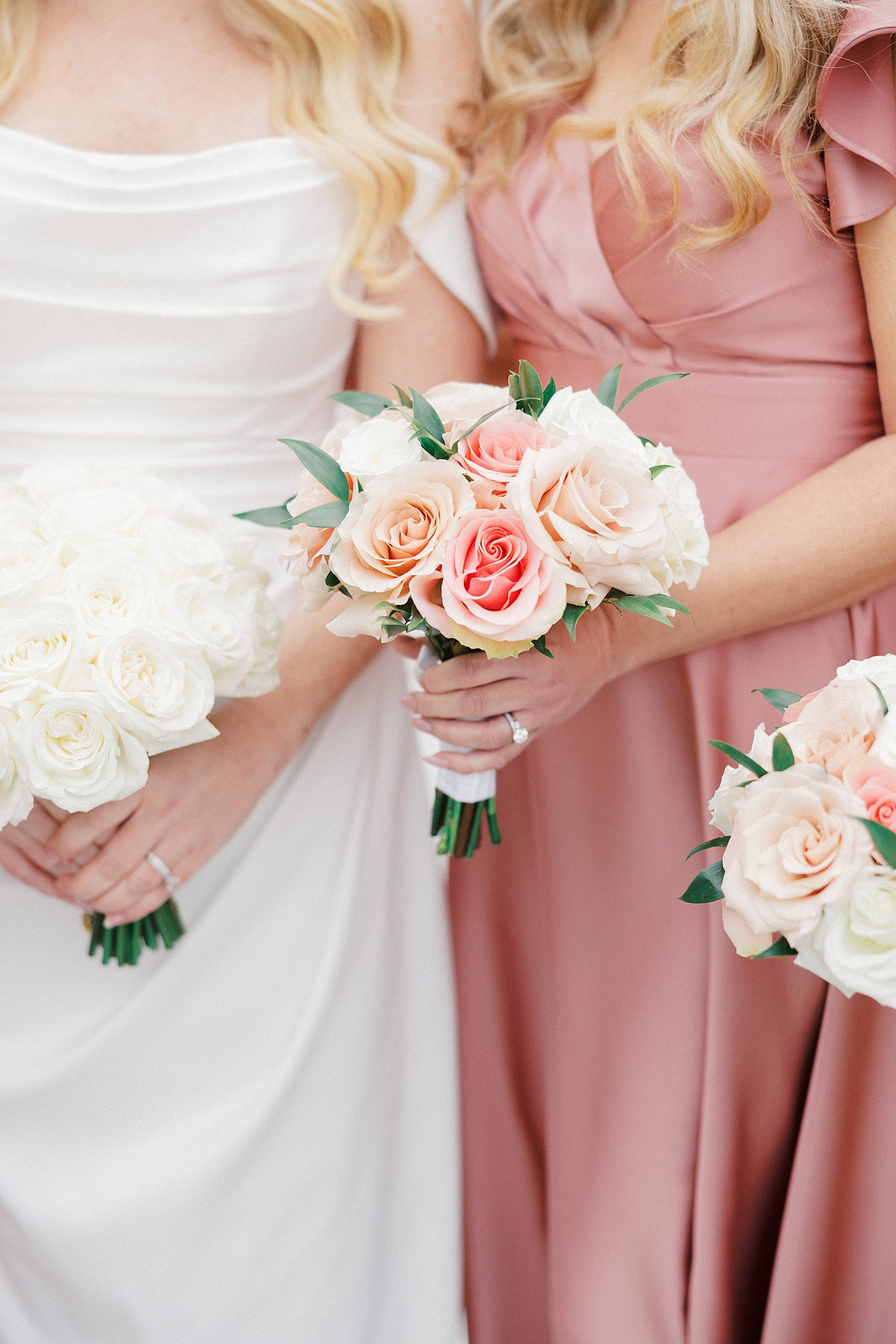Now living in Staten Island, their days are a balance of traveling and quiet nights at home — something that felt especially present throughout their wedding day. They chose Ryland Inn for its ability to reflect both sides of their vision, pairing a classic ceremony in the Grand Ballroom with a reception in the Coach House, where the atmosphere felt warm, inviting, and effortlessly refined. Blush and ivory florals, candlelight, and the natural texture of the wood beams created a setting that was simple, romantic, and completely true to them. Samantha also carried a bouquet with a photo charm honoring her mother and grandmother, a meaningful detail woven into the day.