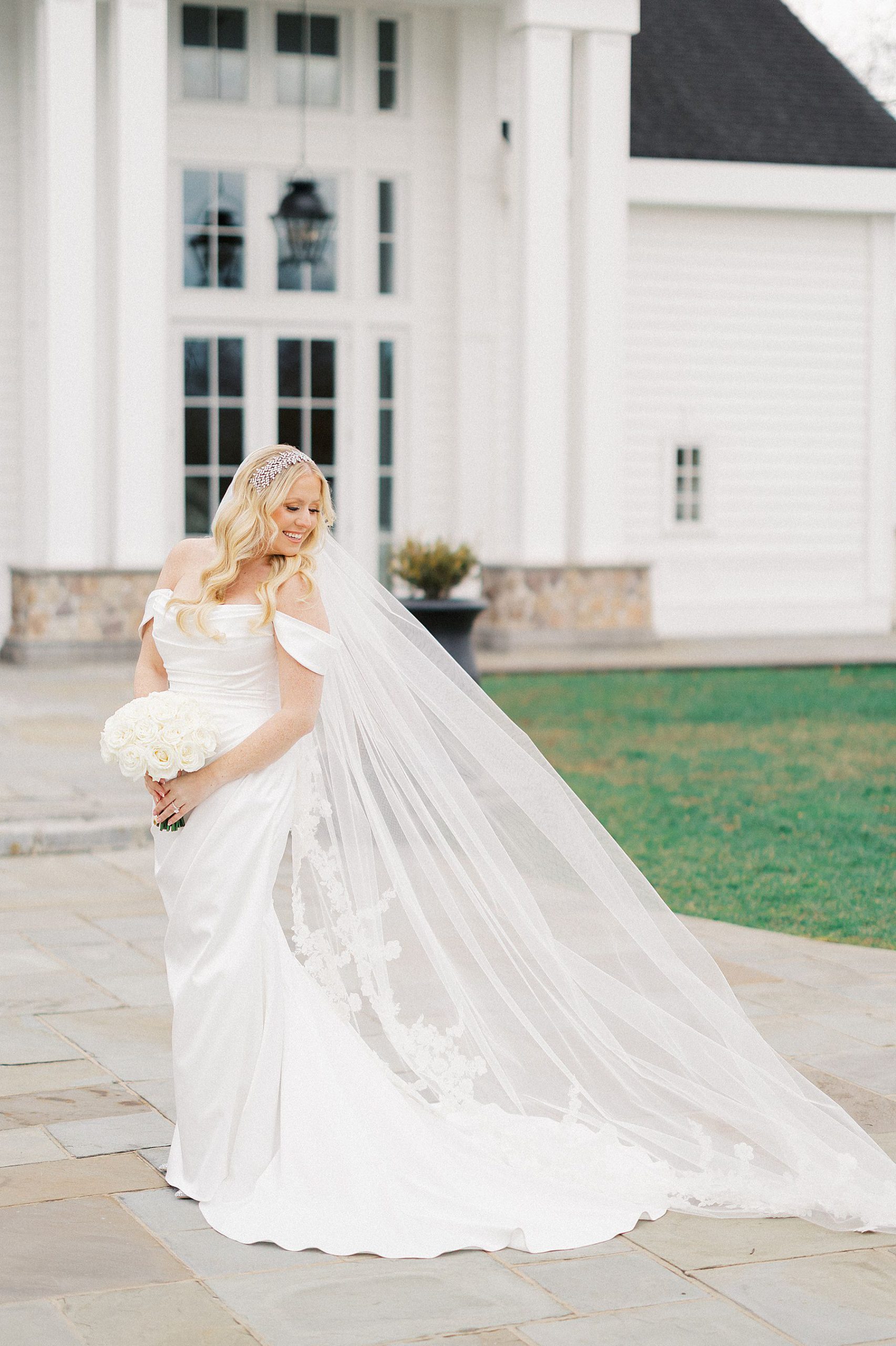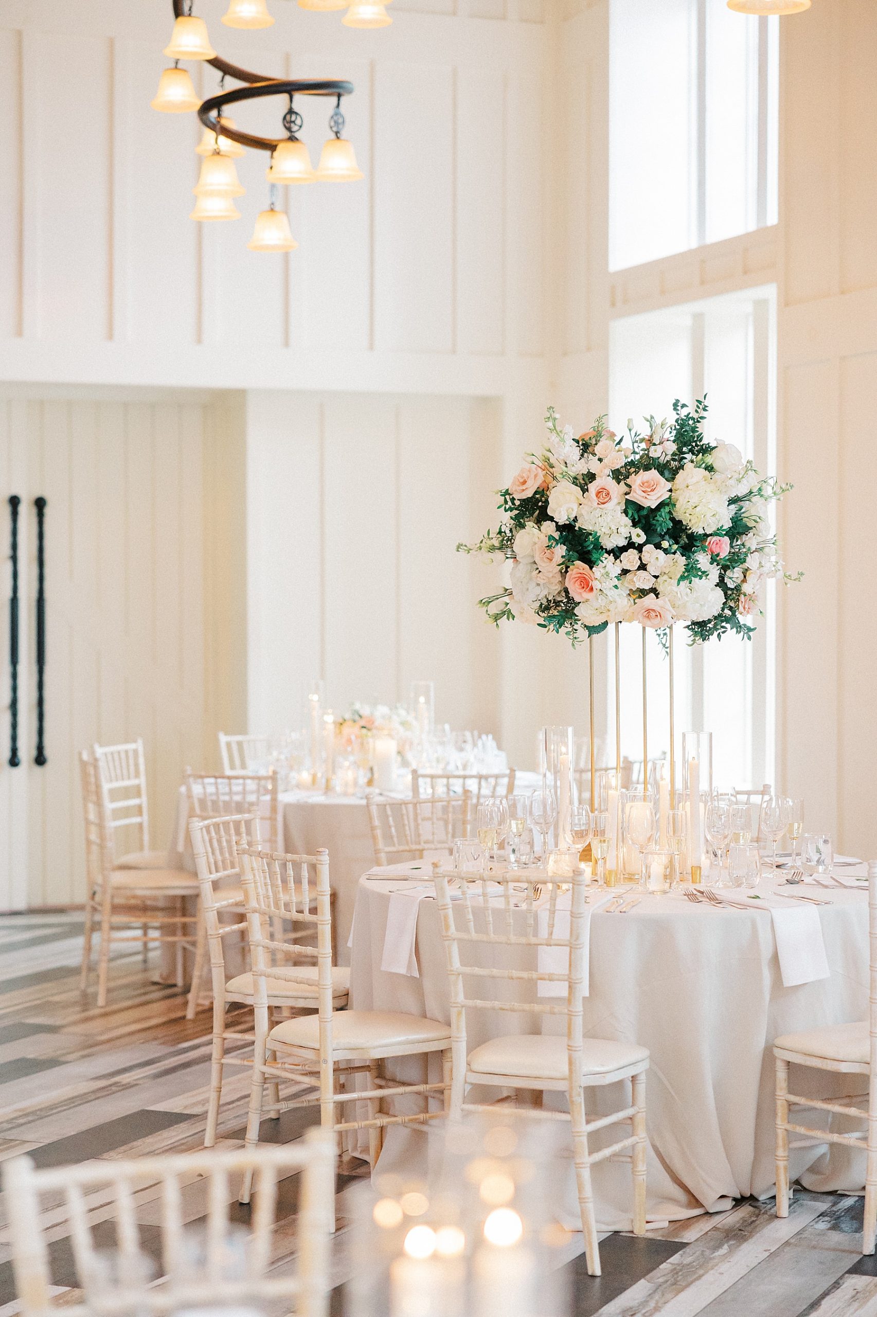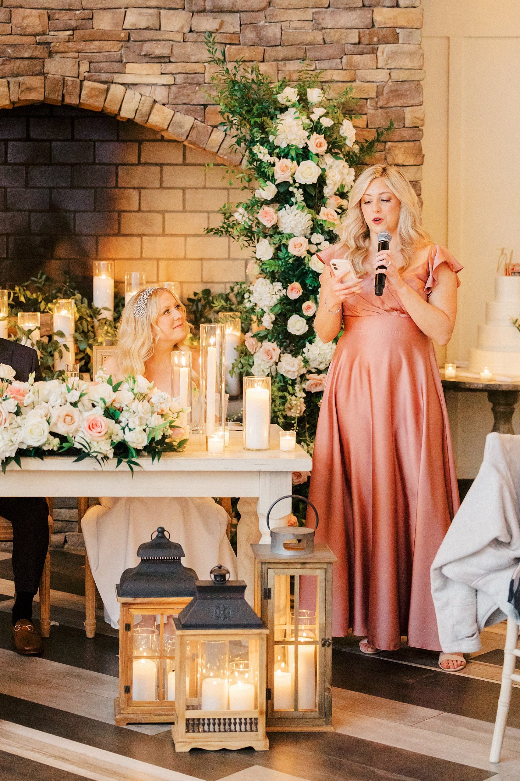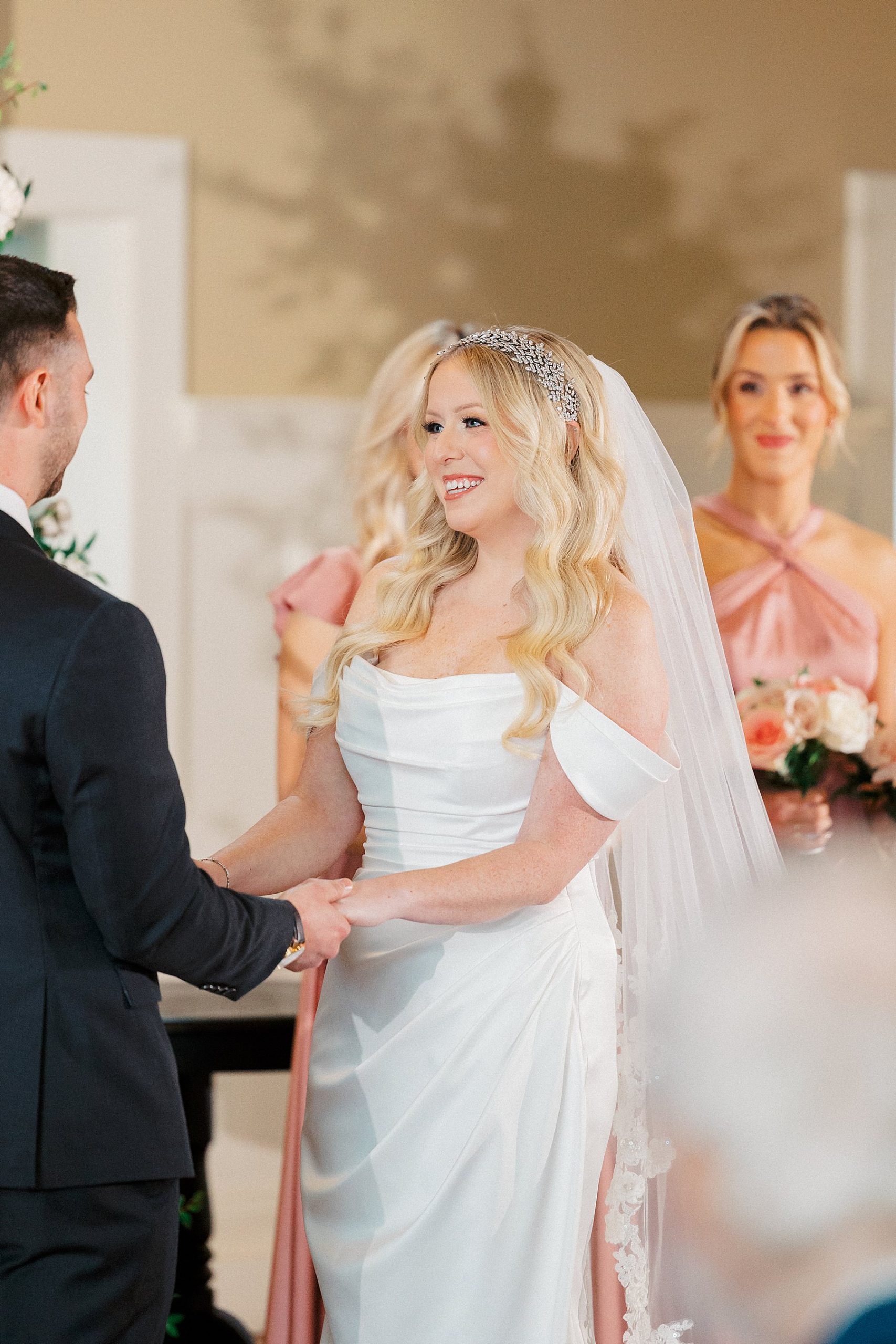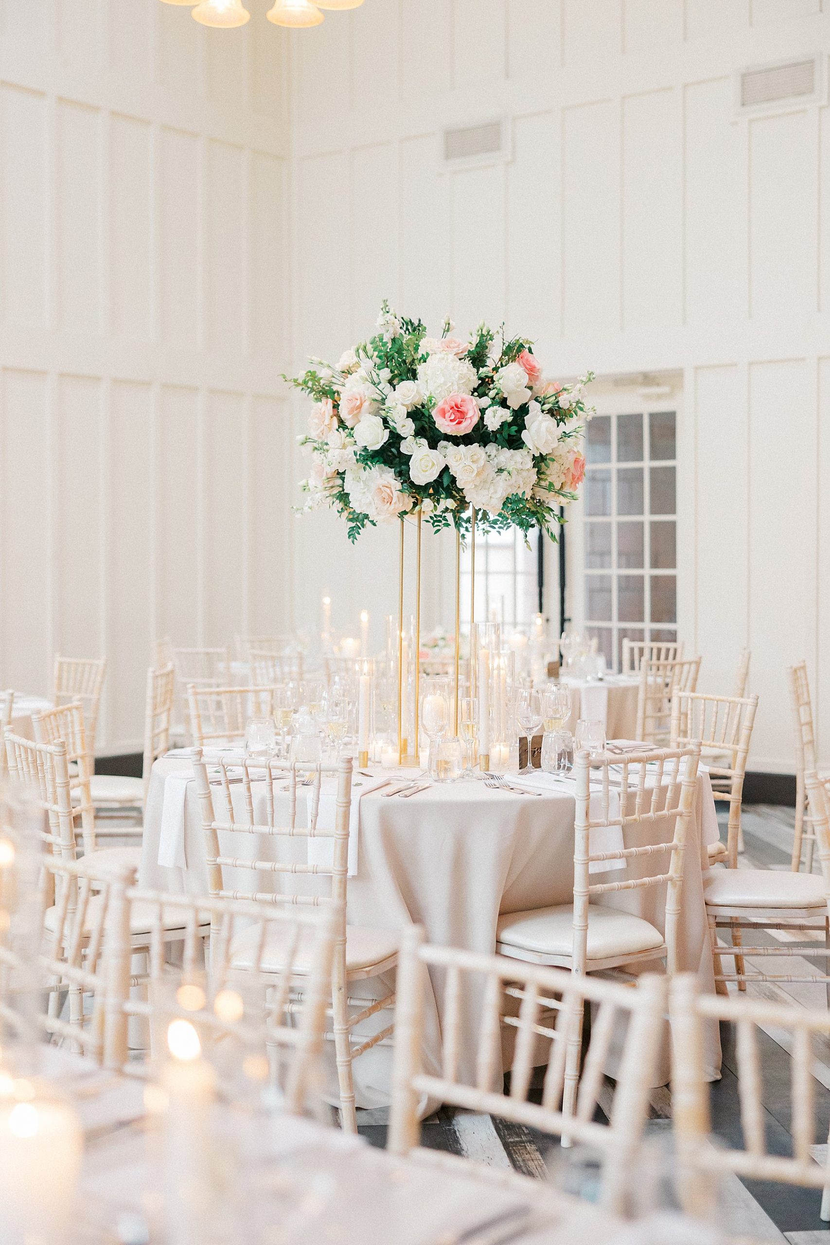 Now living in Staten Island, their days are a balance of traveling and quiet nights at home — something that felt especially present throughout their wedding day. They chose Ryland Inn for its ability to reflect both sides of their vision, pairing a classic ceremony in the Grand Ballroom with a reception in the Coach House, where the atmosphere felt warm, inviting, and effortlessly refined. Blush and ivory florals, candlelight, and the natural texture of the wood beams created a setting that was simple, romantic, and completely true to them. Samantha also carried a bouquet with a photo charm honoring her mother and grandmother, a meaningful detail woven into the day.